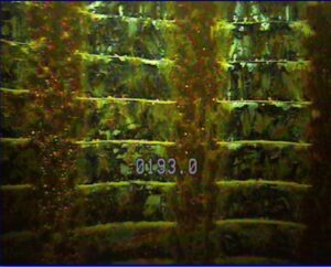 The video showed heavy scale buildup on the blank casing, and throughout the louver-perforated area from 190’-430’, increasing with depth.