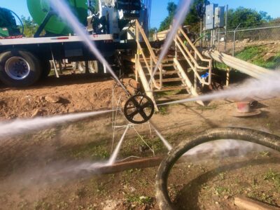 The WellJet® tool was tested on site and then lowered into the hole. Cascade’s crane was positioned at a 90° angle from the well truck and the submersible pump lowered so that it remained above the WellJet® tool. As a general practice, WellJet® prefers evacuation to take place as a separate step after jetting – to avoid the danger of the pump and/or column pipe becoming entangled with the high-pressure hose or the jetting tool itself. However, with shallow wells like this (150’), the risk was deemed acceptable – and in fact, thanks to the skills and focus of Cascade Well & Pump, there were no issues.