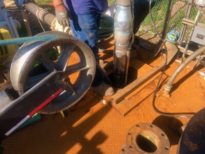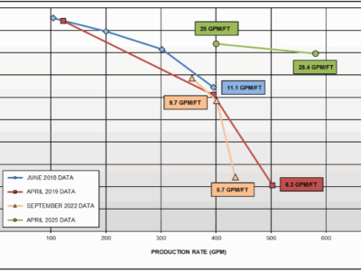 Unfortunately, #4A did not produce as desired. Initial performance (2018): 400 gpm, 36’ of drawdown, for a Specific Capacity of 11.1 gpm/ft. 2019 performance: 500 gpm, 80’ drawdown (right down to the bowls!), Specific Capacity 6.3. 2022 performance: 440 gpm, 77’ drawdown, Specific Capacity 5.7.