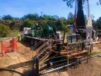 For WellJet®, the first challenge was gaining access to the well, which – due to having been constructed in one of the seasonal channels of the Ventura River – was situated on a raised platform. The District bulldozed an earthen ramp to allow the 40’ well truck to position in front of the platform and extend its 8’ boom over the center of the well. It was a very tight fit!